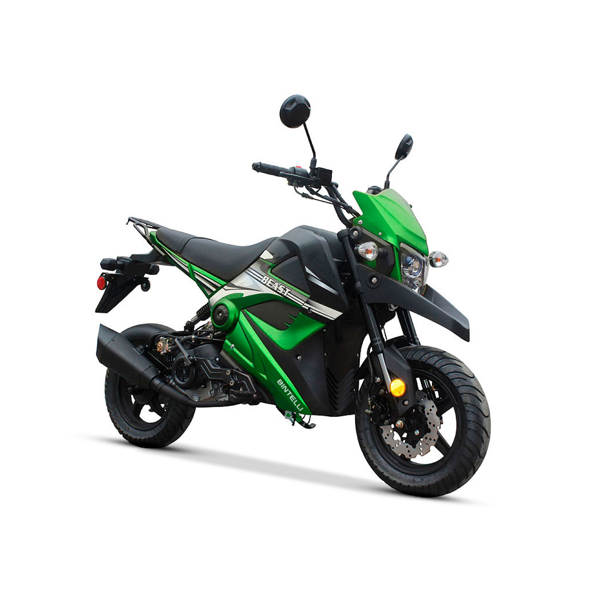 Unleash the Beast! The Bintelli Beast is the newest edition to the Bintelli family. It has the heart of a motorcycle and the soul of a scooter! The Bintelli Beast moped for sale includes a color-changing digital speedometer and a sport sounding exhaust. It comes standard with a 49cc automatic engine, perfect for the entry motorcycle rider! As with our other scooters, the Beast comes fully loaded with many upgraded features such as Duro Tires, Yuasa Battery, NGK Spark Plug, Gates Belt, Halogen Headlight, Stainless Steel exterior hardware, and a 1-year warranty.