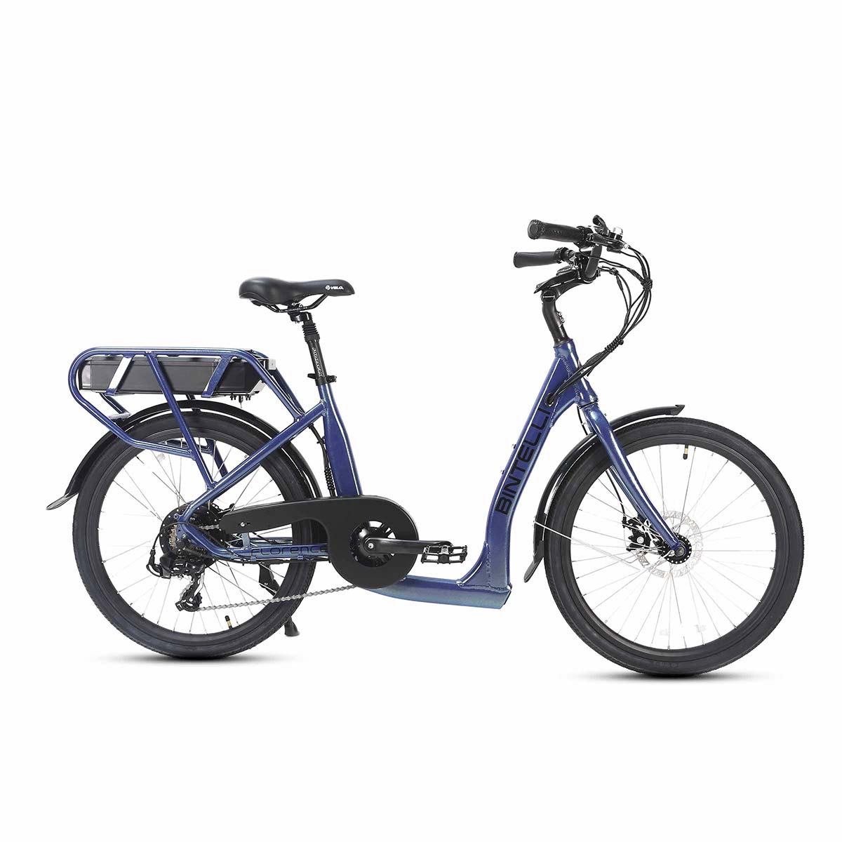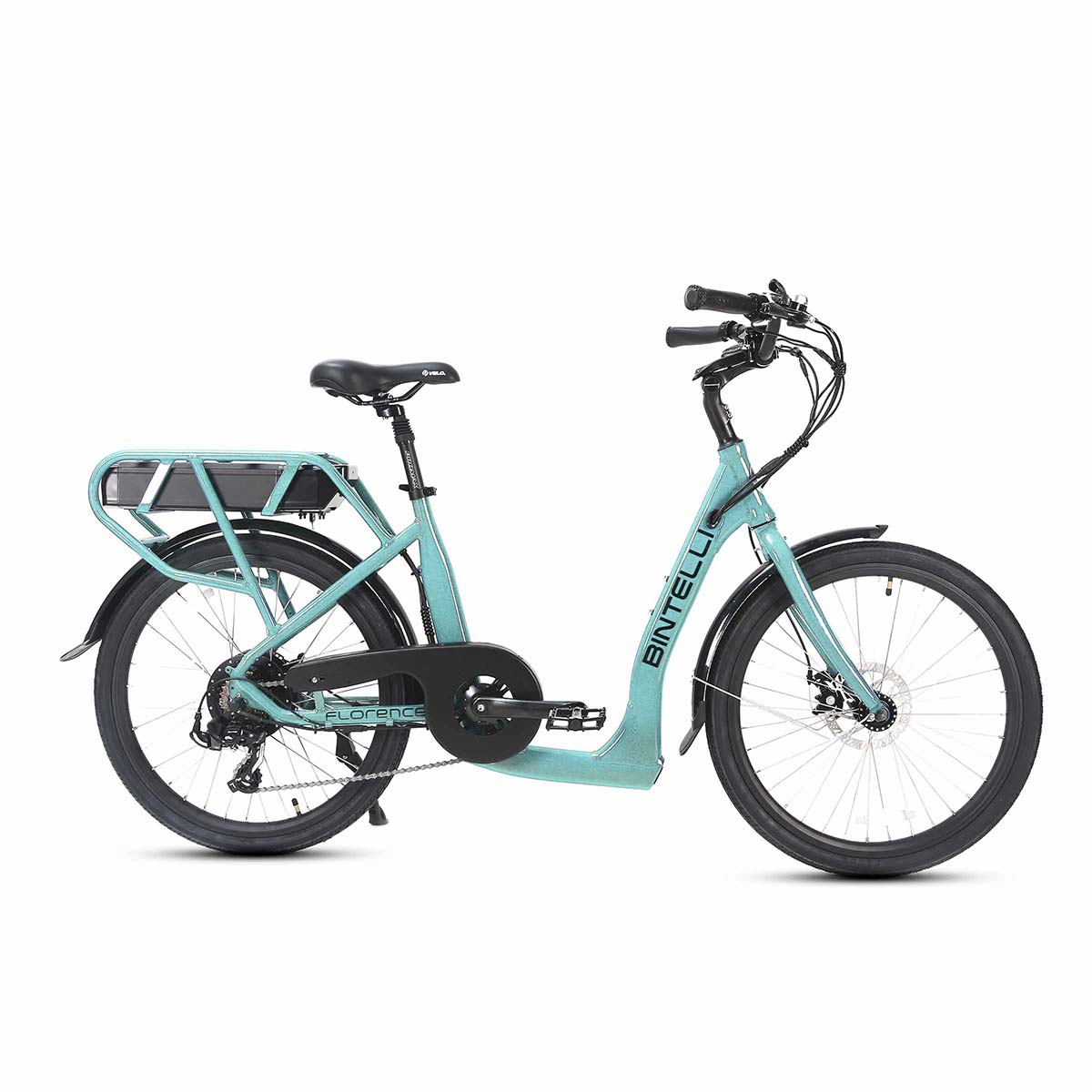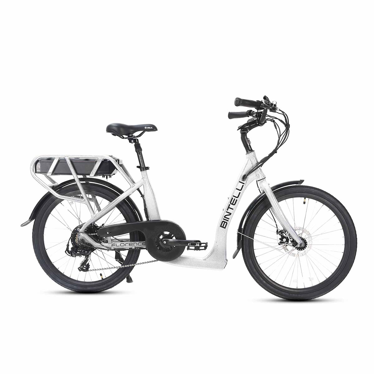 The stylish Florence is one of the best Step-Through E-bikes on the market. This electric bike comes with many standard features, such as a 12.5AH lithium-ion battery, an LCD display, and a powerful 500w motor that is capable of reaching speeds up to 20 mph. For your commuter needs, we’ve added in a rear rack and industry-leading low step-through frame design. The low step-through design allows easy access for adults of all ages, including seniors. Every Bintelli Electric Bicycle comes equipped with a headlight, taillight, seat post suspension, rim reflectors, and a UL-approved charger. This Step-Through Electric Bike is available in many colors, such as silver, dark blue, and white.