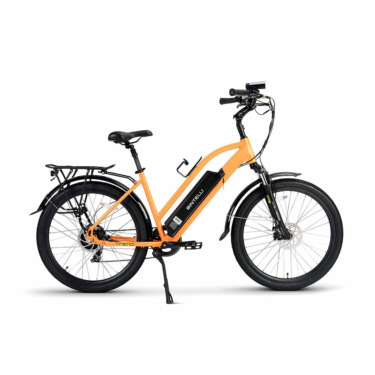 The stylish Trend is one of the top commuter e-bikes on the market. This electric bike comes with many standard features, such as a 12.5AH lithium-ion battery, an LCD display, and a powerful 500w motor that is capable of reaching speeds up to 20 mph. For your commuter needs, we’ve added a rear rack and front suspension. Every Bintelli E-bike comes equipped with a headlight, taillight, seat post suspension, rim reflectors, a water bottle, and a UL-approved charger. This model is available in many colors.